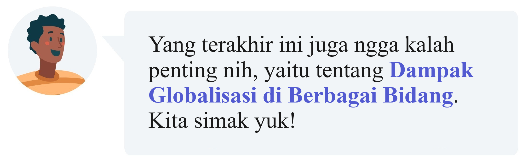 - Bidang budaya, di sini globalisasi budaya telah meningkatkan kontak lintas budaya melalui perkembangan media massa yang akhirnya dapat mengubah pola pikir masyarakat menjadi lebih modern dan dinamis.