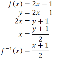 2. Menentukan fungsi invers : mengganti "f(x) = y = ... " menjadi "f-1(y) = x = ... "