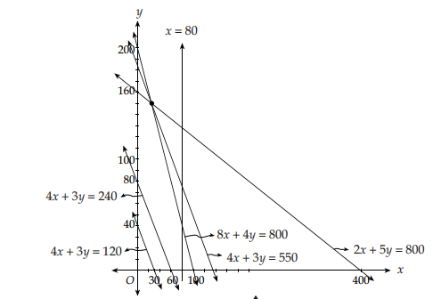 • Titik C adalah titik potong antara garis 8x + 4y = 800 dan 2x + 5y = 800.