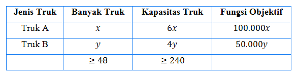 Deo membeli 240 ton beras untuk dijual lagi. Ia menyewa dua jenis truk untuk mengangkut beras tersebut. Truk jenis A memiliki kapasitas 6 ton dan truk jenis B memiliki kapasitas 4 ton. Sewa tiap truk jenis A adalah Rp 100.000,00 sekali jalan dan truk jenis B adalah Rp 50.000,00 sekali jalan. Maka Deo menyewa truk itu sekurang-kurangnya 48 buah. Berapa banyak jenis truk A dan B yang harus disewa agar biaya yang dikeluarkan minimum?