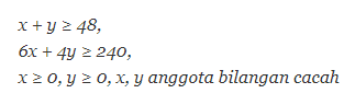 titik potong garis 6x + 4y = 240 dengan sumbu-y, titik potong garis x + y = 48 dengan sumbu-x, dan titik potong garis-garis x + y = 48 dan 6x + 4y = 240