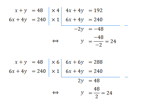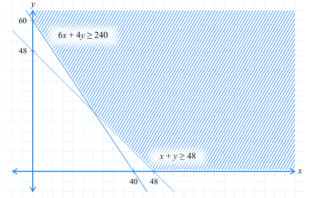 Diperoleh, titik potong garis-garis x + y = 48 dan 6x + 4y = 240 adalah pada titik (24, 24)