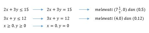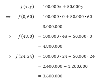 Dengan fungsi objektifnya adalah f(x, y) = 100.000x + 50.000y