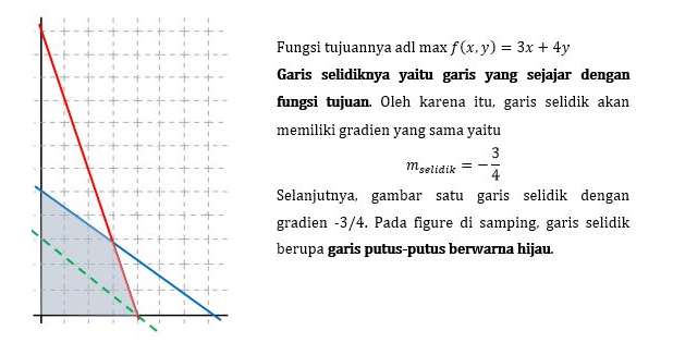 c. Untuk menentukan nilai maksimum fungsi tujuan maka carilah garis selidik yang jaraknya terbesar terhadap titik pusat O(0, 0) dan berada pada daerah penyelesaian. Sedangkan untuk menentukan nilai minimum fungsi tujuan maka carilah garis selidik yang jaraknya terkecil terhadap titik pusat O(0, 0) dan berada pada daerah penyelesaian.