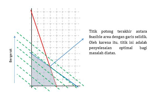 Dari gambar di atas tampak bahwa garis selidik 4x + 3y = 550 melalui titik C(25, 150). Ini berarti, fungsi objektif f(x, y) = 40.000x + 30.000y mencapai maksimum pada titik C(25, 150).
