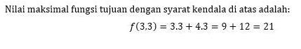 Jadi penyelesaian optimalnya yaitu (3,3) dan nilai maksimalnya yaitu 21