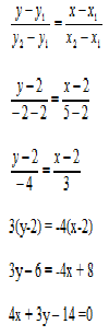 Jadi, persamaan garis yang melalui titik (2,2) dan (5,-2) adalah 4x + 3y – 14 =0