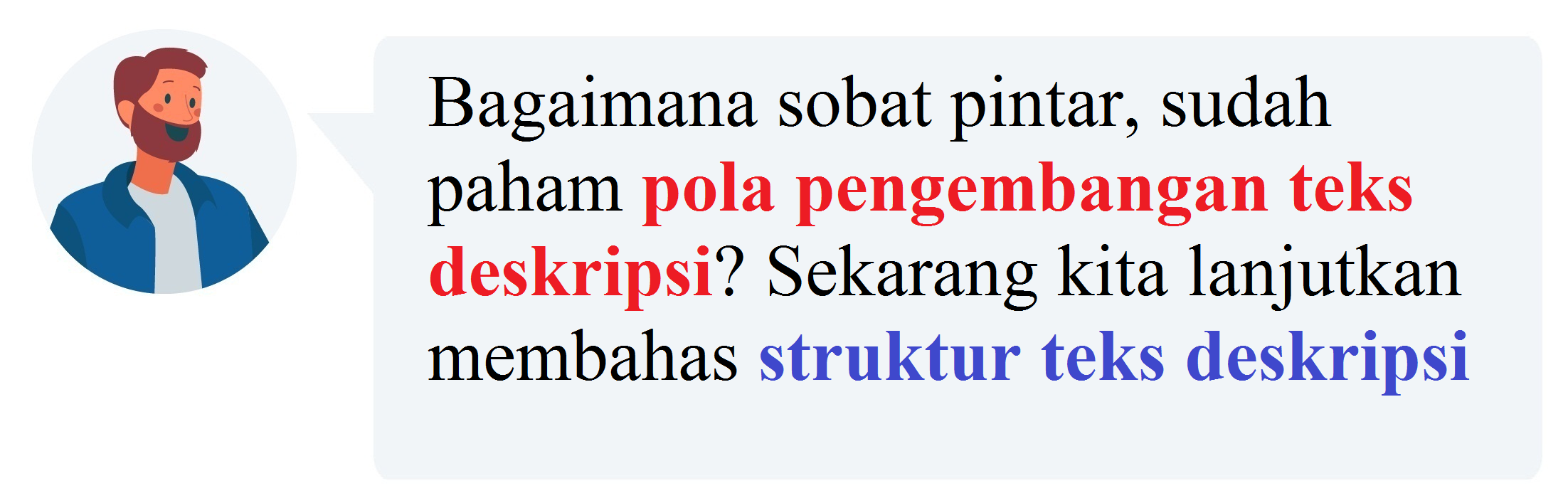 Sobat Pintar pola pengembangan teks deskripsi adalah sebagai berikut: