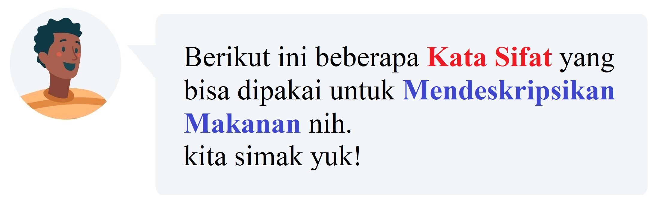 Berikut ini adalah beberapa kata sifat dalam bahasa Inggris yang dapat digunakan untuk mendeskripsikan makanan: