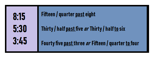 Kalau cara kedua itu jika kita membaca menitnya terlebih dahulu, lalu dilanjut dengan membaca jamnya. Dibawah ini terdapat cara membacanya. Past digunakan untuk menit ke 01 – 30 atau dalam Bahasa Indonesia biasa disebut lewat (Jam 7 lewat 5 menit = It’s five minutes past seven). To digunakan untuk menit ke 31 – 59 atau dalam Bahasa Indonesia biasa disebut kurang (Jam 7 kurang 5 menit = It’s five minutes to seven).