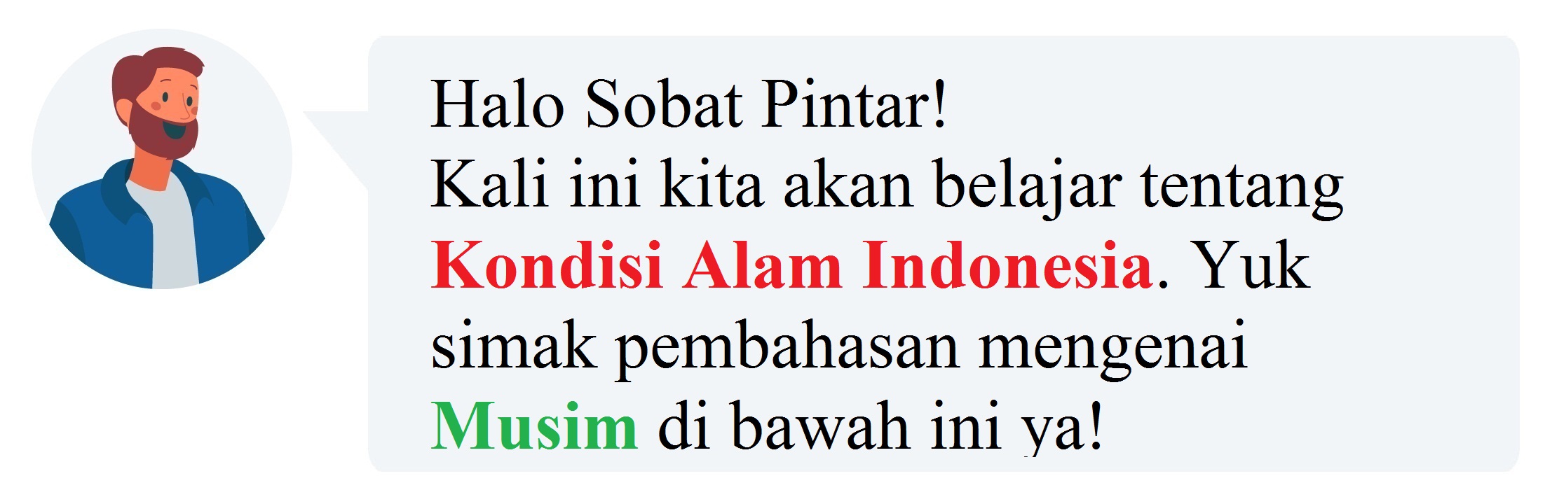 Iklim adalah rata-rata keadaan udara (meliputi antara lain: suhu, tekanan udara, penyinaran matahari, kelembaban, dan curah hujan) pada suatu waktu dan wilayah tertentu di permukaan bumi. Iklim merupakan keadaan rata-rata cuaca dalam waktu dan daerah luas. Kondisi iklim dapat ditentukan menggunakan data cuaca selama bertahun-tahun. Posisi Indonesia mengakibatkan Indonesia memiliki iklim tropis. Iklim tropis memiliki ciri-ciri yaitu: