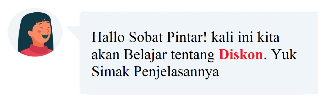 Saat kita pergi ke toko, minimarket, supermarket, atau tempat-tempat jualan lainnya kadang kita menjumpai tulisan Diskon 10%, diskon 20%, diskon 50%. Secara umum, diskon merupakan potongan harga yang diberikan oleh penjual terhadap suatu barang. Misal suatu barang bertuliskan harga Rp200.000,00 dengan diskon 15%. Ini berarti barang tersebut mendapatkan potongan sebesar 15% x 200.000 = 30.000. Sehingga harga barang tersebut setelah dipotong adalah 200.000 - 30.000 = 170.000