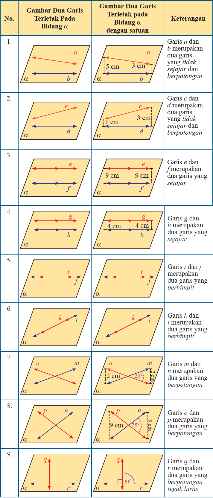 Agar Sobat Pintar dapat memahami tentang materi kedudukan dua garis dengan baik, mari kita lihat Tabel berikut.