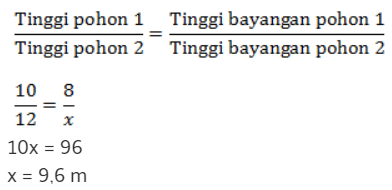 Jika dimisalkan panjang bayangan pohon 12 meter = x. Jika didasarkan pada kesebangunan maka: