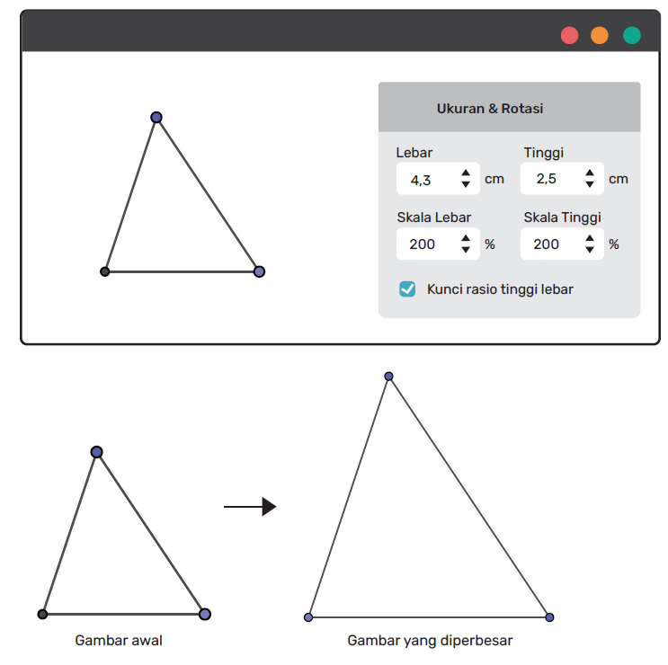 Sekarang coba Sobat bandingkan dengan menggunakan fitur size options pada aplikasi yang digunakan. Dalam hal ini, segitiga yang terletak di sebelah kanan adalah segitiga yang dihasilkan setelah Sobat memperbesar segitiga sebelah kiri sebesar 200%. Untuk memastikan sebangunnya, kita perlu memeriksa sifat-sifat segitiga sebangun. Jika sifat-sifat tersebut tetap sama pada segitiga yang diperbesar, maka segitiga kanan sebangun dengan segitiga awal.