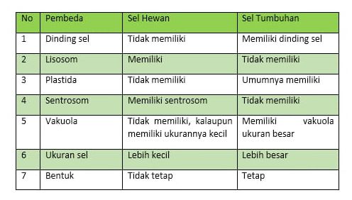 Perbedaan sel hewan dan sel tumbuhan dirangkum dalam tabel sebagai berikut.