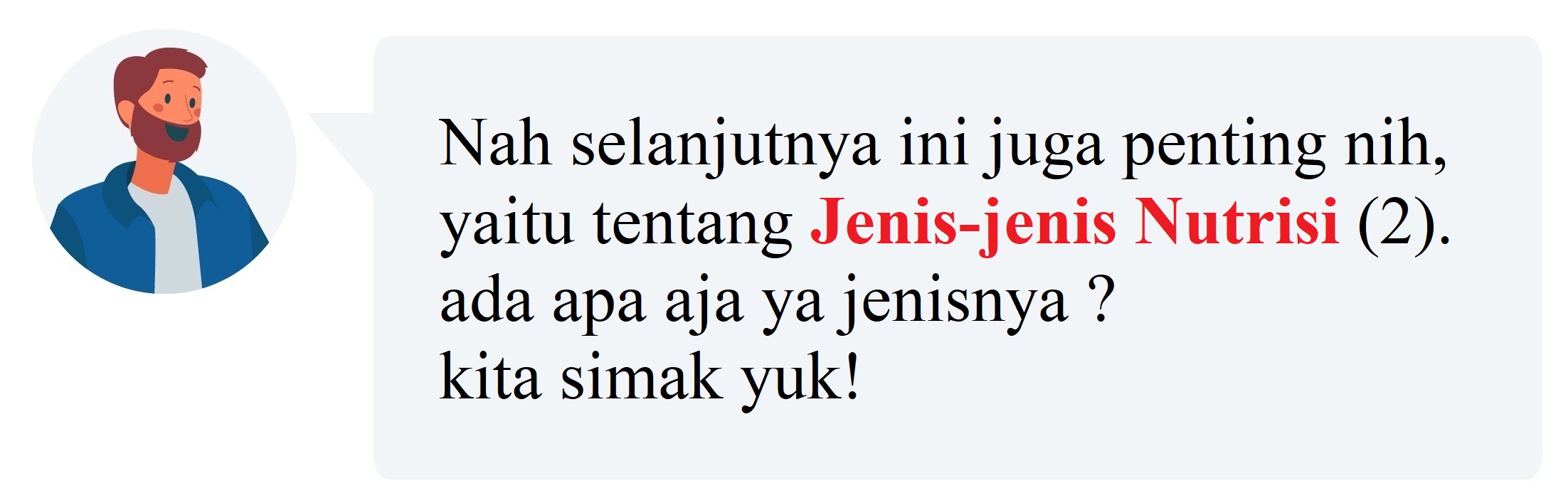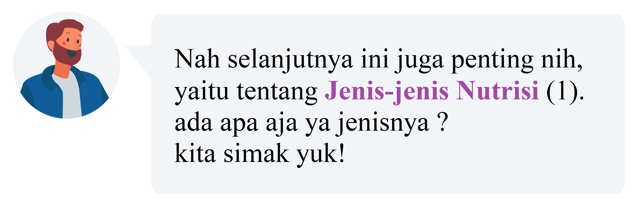 Sobat pintar, tadi sudah dijelaskan bahwa energi ini berasal dari makanan yang kamu makan. Nah makanan yang kamu konsumsi seharusnya tidak hanya sekedar mengenyangkan tetapi harus mengandung nutrisi atau gizi. Nutrisi atau gizi adalah zat yang dibutuhkan makhluk hidup sebagai sumber energi, mempertahankan kesehatan, pertumbuhan, dan untuk berlangsungnya fungsi normal pada setiap jaringan dan organ tubuh.