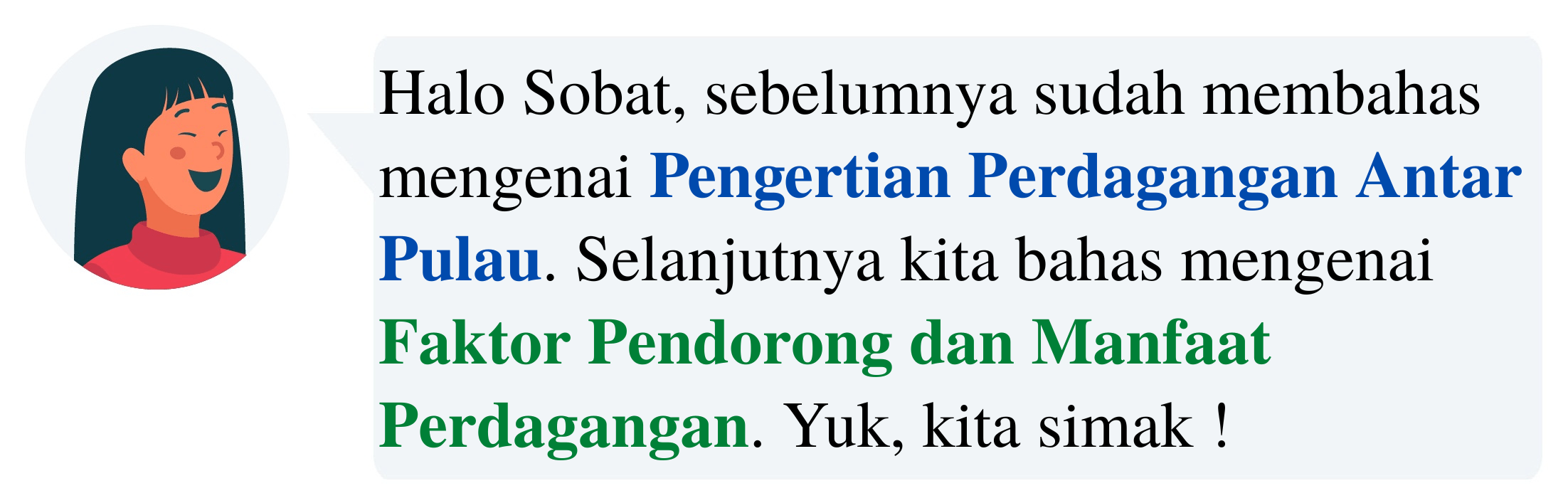Sobat pintar kalian tau gak ? Perdagangan atau perniagaan merupakan kegiatan tukar menukar barang atau jasa berdasarkan kesepakatan bersama tanpa ada unsur pemaksaan. Perdagangan antar daerah atau antar pulau merupakan perdagangan yang dilakukan oleh penduduk/ lembaga suatu daerah atau pulau dengan penduduk/lembaga suatu daerah atau pulau lain dalam satu batas wilayah negara atas dasar kesepakatan bersama.