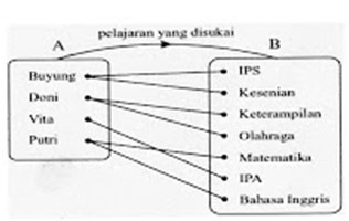 Gambar dibawah ini menunjukkan relasi “pelajaran yang disukai” dari himpunan A ke himpunan B. Arah panah menunjukkan anggota-anggota himpunan A yang berelasi dengan anggota-anggota tertentu pada himpunan B.