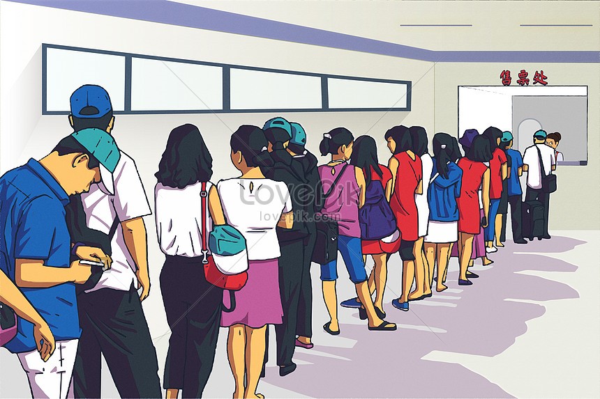 Wahhh, terlihat belasan orang sedang berbaris menuju ke loket ya, Sobat. Dari sekumpulan orang yang sedang berbaris tersebut, menurut Sobat orang yang menggunakan baju apa yaa yang berada di urutan tengah?