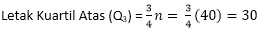 Kita cari letak data Kuartil atas (Q3) terlebih dahulu dengan jumlah data ada sebanyak 40