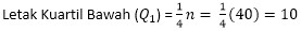 Kita cari letak data Kuartil bawah (Q1) terlebih dahulu dengan jumlah data ada sebanyak 40