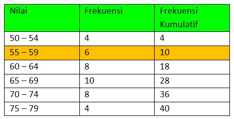 Kuartil bawah terletak pada data ke 10, artinya terletak pada interval 55 – 59