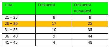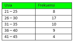 Perhatikan tabel usia seseorang yang mengantri di bank sebagai berikut!