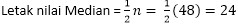 Median terletak pada data ke 24, artinya terletak pada interval 26 – 30