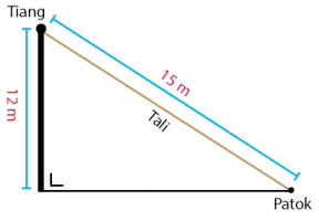 Sebuah tiang tingginya 12 m berdiri tegak di atas tanah datar. Dari ujung atas tiang ditarik seutas tali ke sebuah patok pada tanah. Jika panjang tali 15 m, maka jarak patok dengan pangkal tiang bagian bawah adalah ….