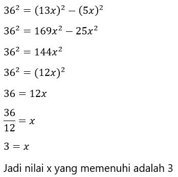 Jika 5x, 36, 13x merupakan tripel Pythagoras, maka berapa nilai x agar memenuhi ?