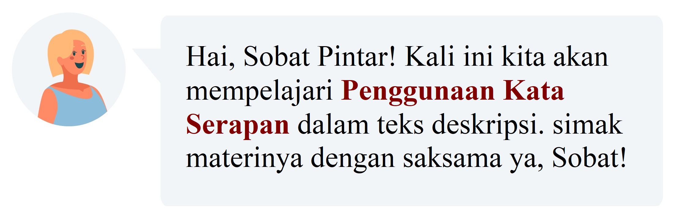 Saat membaca teks, termasuk tes deskripsi, mungkin kalian menemukan kata yang tidak biasa digunakan dalam percakapan sehari-hari, misalnya kata serapan dari bahasa daerah dan bahasa asing. Kata-kata tersebut biasanya digunakan karena belum ada padanan katanya dalam bahasa Indonesia yang dapat mendeskripsikan maknanya secara tepat.