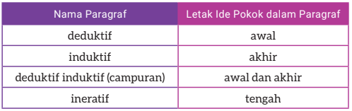 Berdasarkan letak ide pokoknya, paragraf dibedakan menjadi empat jenis, yaitu deduktif, induktif, campuran, dan ineratif.