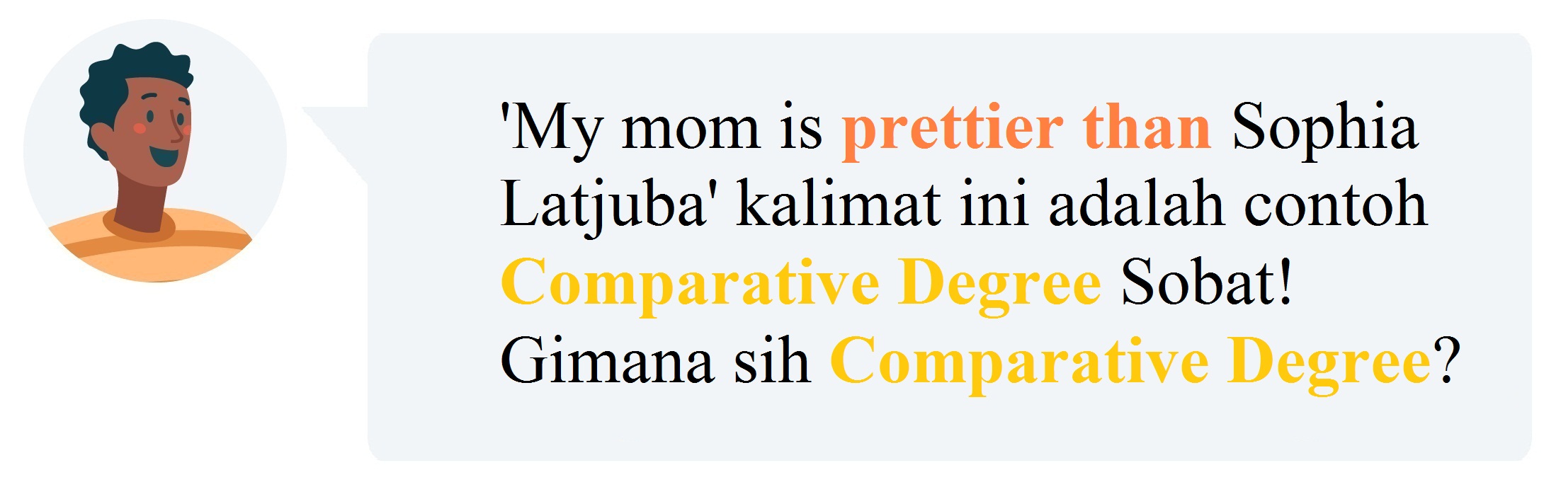 Kata – kata tersebut adalah contoh dari Degree of Comparison dalam bahasa Inggris. Degree of Comparison adalah perbandingan antara dua subjek atau lebih mengenai kualitas kegiatan (adverb) atau kualitas sifat (adjective).