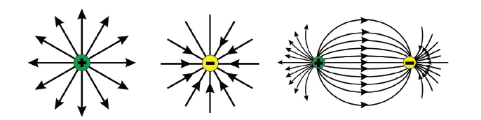 Dalam gambar ini, kita memiliki dua muatan listrik: satu muatan positif (ditandai dengan tanda plus [+]) dan satu muatan negatif (ditandai dengan tanda minus [-]). Garis-garis yang menghubungkan keduanya adalah medan listrik. Arah medan listrik keluar dari muatan positif dan menuju muatan negatif. Ini menunjukkan bahwa muatan positif akan ditarik ke arah muatan negatif oleh medan listrik.
