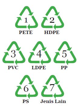 Periksalah bagian bawah botol plastik air mineral atau kotak makanan! Sobat Pintar akan menemukan beberapa logo seperti pada bawah.