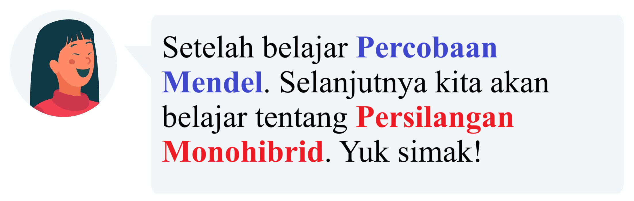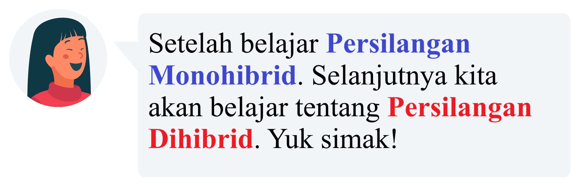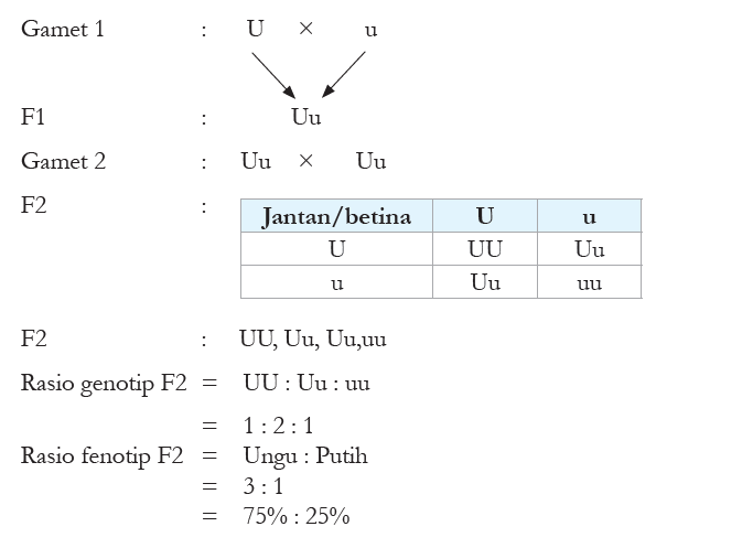Contoh Persilangan Monohibrid: Mendel menyilangkan tanaman ercis berbunga ungu dengan tanaman ercis berbunga putih. Hasil persilangan menunjukkan bahwa pada generasi pertama (F1) semua keturunan berbunga ungu. Jika generasi pertama (F1) disilangkan sesamanya, akan dihasilkan keturunan generasi kedua (F2) dengan perbandingan tertentu.