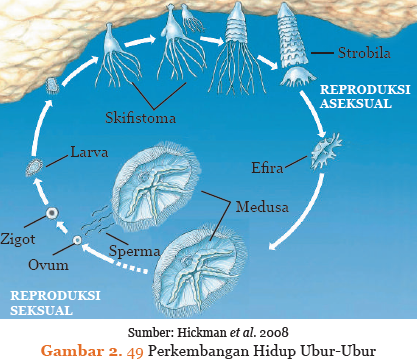 Tahukah sobat pintar hewan ubur-ubur? Selama perkembangan hidupnya, ubur-ubur dapat berkembang biak secara seksual dan secara aseksual. Ubur-ubur seringkali dijumpai dalam bentuk medusa dan berada pada tahap seksual yaitu dapat menghasilkan sel kelamin. Sel kelamin dilepaskan ke air dan dapat mengalami fertilisasi. Zigot akan berkembang menjadi larva. Jika berada pada tempat yang sesuai, larva akan tumbuh menjadi polip yang disebut skifistoma. Saat dalam tahap polip, ubur-ubur dapat berkembang biak secara aseksual melalui pembentukan tunas. Polip akan berkembang dan menghasilkan strobila. Strobila akan terlepas dari induknya dan berkembang menjadi medusa kecil yang disebut efira. Efira selanjutnya tumbuh menjadi medusa dewasa.