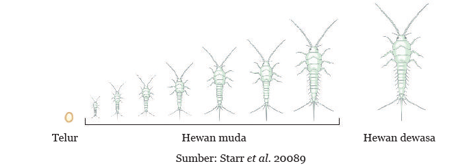 Pada beberapa jenis hewan, telur akan berkembang menjadi hewan muda yang memiliki struktur dan fungsi organ mirip dengan hewan dewasa (imago). Selama berkembang menuju kedewasaan, hewan muda tidak mengalami banyak perubahan pada struktur dan fungsi organ tubuh. Selama berkembang, hewan muda hanya mengalami pertambahan ukuran sehingga menjadi lebih besar.