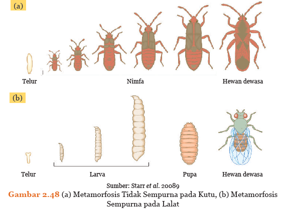 Pada hewan yang mengalami metamorfosis sempurna, telur akan berkembang menjadi hewan muda yang disebut larva. Larva memiliki struktur dan fungsi organ yang sangat berbeda dengan hewan dewasa. Pada hewan tertentu misalnya kupu-kupu dan lalat, larva berkembang menjadi pupa. Selanjutnya pupa berkembang menjadi hewan dewasa. Selama berkembang, struktur dan fungsi organ tubuh mengalami banyak perubahan sehingga menjadi hewan dewasa.