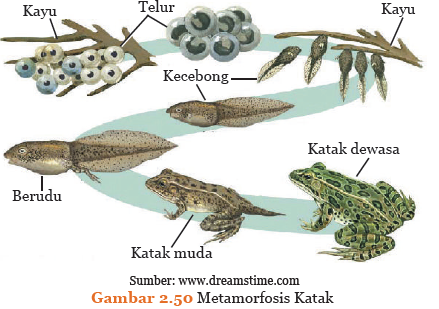 Selain ubur-ubur, katak juga mengalami perkembangan hidup yang menarik untuk dipelajari. Pernahkah kamu menjumpai puluhan bahkan ratusan kecebong pada suatu kolam? Tahukah sobat pintar darimana asal kecebong? Katak dewasa akan menghasilkan ratusan telur. Telur kemudian menetas menjadi kecebong, kecebong selanjutnya berkembang menjadi berudu yang memiliki kaki. Berudu berkembang menjadi katak muda yang kemudian berkembang menjadi katak dewasa.