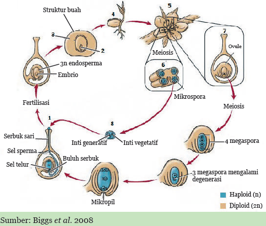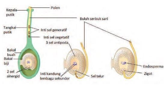 Satu inti sel sperma membuahi inti sel telur (ovum) membentuk zigot (calon individu baru), dan satu inti sel sperma yang lain membuahi inti kandung lembaga sekunder membentuk endosperma atau cadangan makanan. Setelah terjadi pembuahan, bakal biji akan berkembang menjadi biji dan bakal buah berkembang menjadi buah sehingga menyelubungi biji. Biji nantinya akan menyebar dan apabila jatuh pada tempat yang sesuai akan berkecambah dan tumbuh menjadi tumbuhan baru.