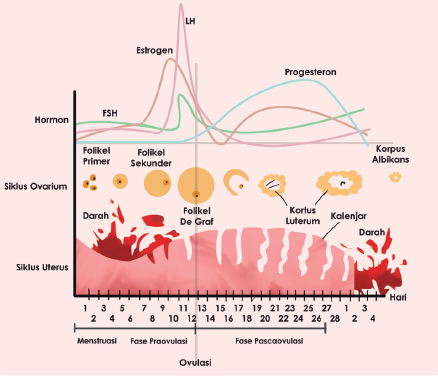 - Fase Menstruasi: Ini adalah awal siklus ketika sel telur yang belum matang mulai berkembang. Selama fase ini, lapisan rahim yang telah disiapkan untuk menerima sel telur yang telah dibuahi meluruh, yang mengakibatkan menstruasi atau keluarnya darah dari alat kelamin wanita.