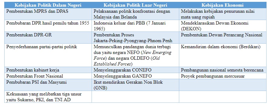 Dalam masa demokrasi terpimpin terdapat pelaksanaan kebijakan-kebijakan sebagai berikut.