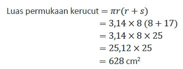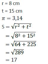 Suatu kerucut dibentuk dengan jari-jari 8 cm, tinggi 15 cm, dan pi = 3,14. Luas seluruh permukaan kerucut tersebut adalah ….