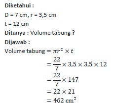 Diketahui tabung dengan diameter 7 cm dan tinggi 12 cm. Volume tabung tersebut adalah ....