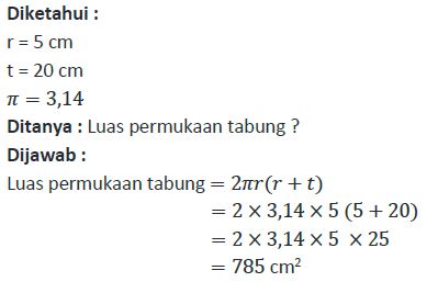 Suatu tabung mempunyai jari-jari alas 5 cm dan tinggi 20 cm, dengan menggunakan pi = 3,14. luas permukaannya adalah ….