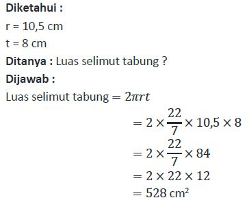 Sebuah tabung memiliki jari-jari 10,5 cm dan tinggi 8 cm. Tentukan luas selimut tabung tersebut ….