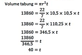 Volume tabung adalah hasil dari luas alas tabung dengan tinggi tabung atau dirumuskan sebagai berikut: