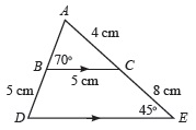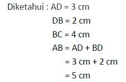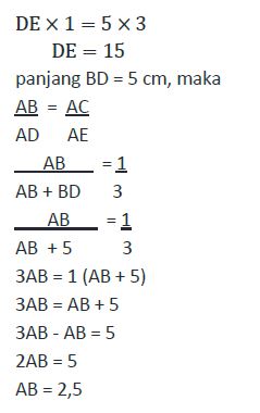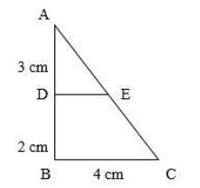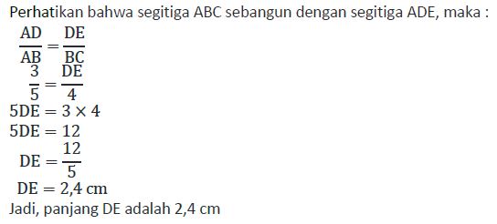 Segitiga ABC siku-siku di B. Jika AD = 3 cm, DB = 2 cm, dan BC = 4 cm, maka panjang DE adalah ....